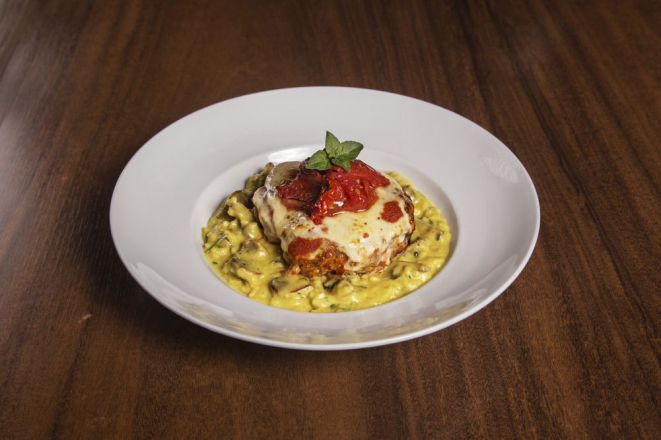 Copa lombo gratinada com risoto de cogumelos e açafrão