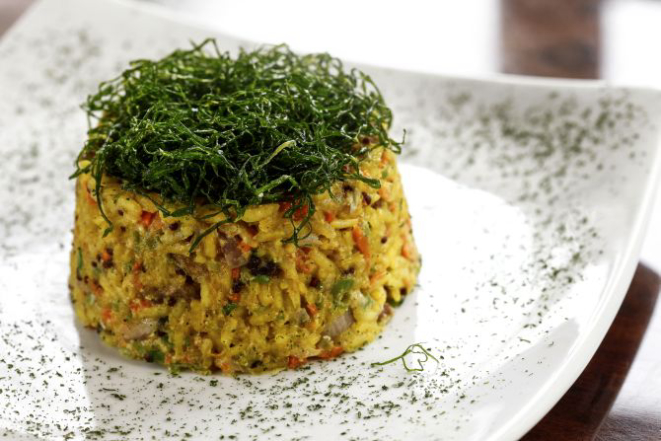 Entre os pratos principais, uma boa pedida é o nasi goreng de lula e camarão (Indonésia), feito com arroz jasmine, frutos do mar, legumes, cogumelos e molho de ostra. O cliente escolhe o nível da picância.