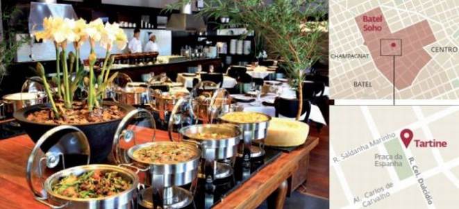 Conheça: dez pratos quentes, 16 opções de saladas, carnes grelhadas e massas feitas na hora, escolhidas pelo cliente. É assim o almoço no Restaurante Tartine. Dentre opções de massas estão nhoque, penne e ravióli. Depois, o molho entre branco, funghi, bolonhesa, de queijos, e mais acompanhamentos. Nas carnes, os destaques são as de carneiro, filé argentino, picanha e peito de frango. Durante a noite, a casa abre somente para eventos. Quanto: R$ 43,90 – Por pessoa, de segunda a sexta. Nos fins de semana e feriados custa R$ 48,90.