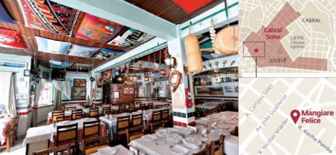 Conheça: decoração trazida das cantinas italianas, as camisetas e bandeiras do Mangiare Felice, penduradas no teto passam a sensação de estar comendo em uma casa de família: é como se o almoço estivesse na mesa e as roupas, no varal. Todas as camisetas ( já chegaram a 400) foram presentes da clientela, assim como as bandeiras, mais recentes. O Mangiare foi eleito o melhor da categoria Delivery no Prêmio Bom Gourmet 2013 com a entrega do prato Filet à Oswaldo Aranha. Quanto: R$ 97,40 – Filet à Oswaldo Aranha, duas pessoas.