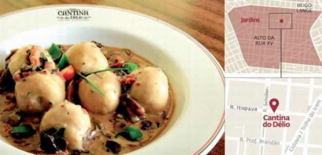 Conheça: dezembro é um dos últimos meses para provar o nhoque de batata recheado de gorgonzola ao molho funghi na Cantina do Délio. A delícia foi desenvolvida especialmente para o Prato da Boa Lembrança: todo cliente que pedir o Gnocchi ripieni al gorgonzola e funghi trifolati, como está escrito no cardápio, ganha um prato de cerâmica pintado à mão como souvenir. Quanto: R$ 59, porção individual e generosa. Onde: Cantina do Délio.