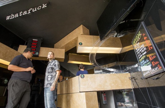 A decoração do novo espaço segue o modelo da loja original, inaugurada na Rua Vicente Machado há quase dois anos. “O Whatafuck é um lugar de socialização, por isso não temos mesas ou cadeiras, proporcionando uma experiência gastronômica diferente para nossos clientes”, afirma Daniel. O projeto assinado pela Y Arquitetos conta com cores neutras como o cinza e o preto e estruturas modulares, que podem ser usadas como mesas, cadeiras ou apenas lugares de apoio. Na área de bar, um escorregador transparente transporta os hambúrgueres para os clientes.