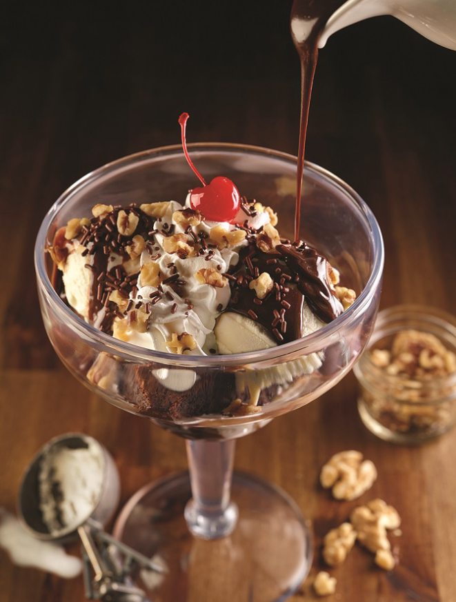 Entre as sobremesas estão os clássicos americanos como o Hot Fudge Brownie, servido em taça com sorvete de baunilha, chantilly, nozes, cereja marrasquino, chocolate granulado e calda quente. Há também o cheesecake de bolacha Óreo e a tradicional torta de maçã.