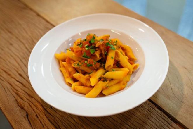 Folhas verdes com salmão curado, penne com fonduta de queijo e legumes assados com molho escuro e mignon são alguns dos novos pratos do almoço executivo do Hoog Deli, café e restaurante que fica na Praça Osório, embaixo da Universidade Positivo, e é inspirado em Nova York.