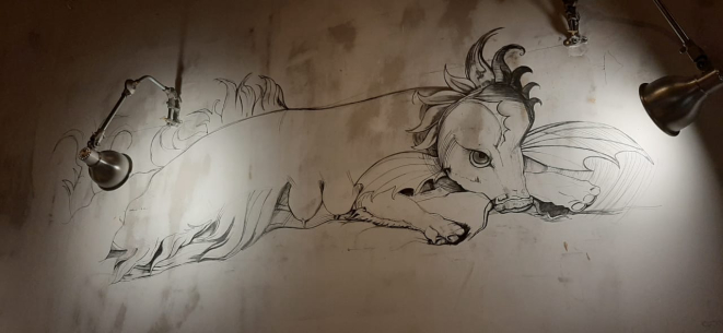 Uma das marcas dos empreendimentos dos Giovanonni, o monstro marinho, é desenhado por Tato e tem sua versão carioca. A ilustração ainda inacabada é feita a lápis está na parede principal do salão. As luminárias, que dão um toque contemporâneo à casa, foram trazidas na mala por Aline.