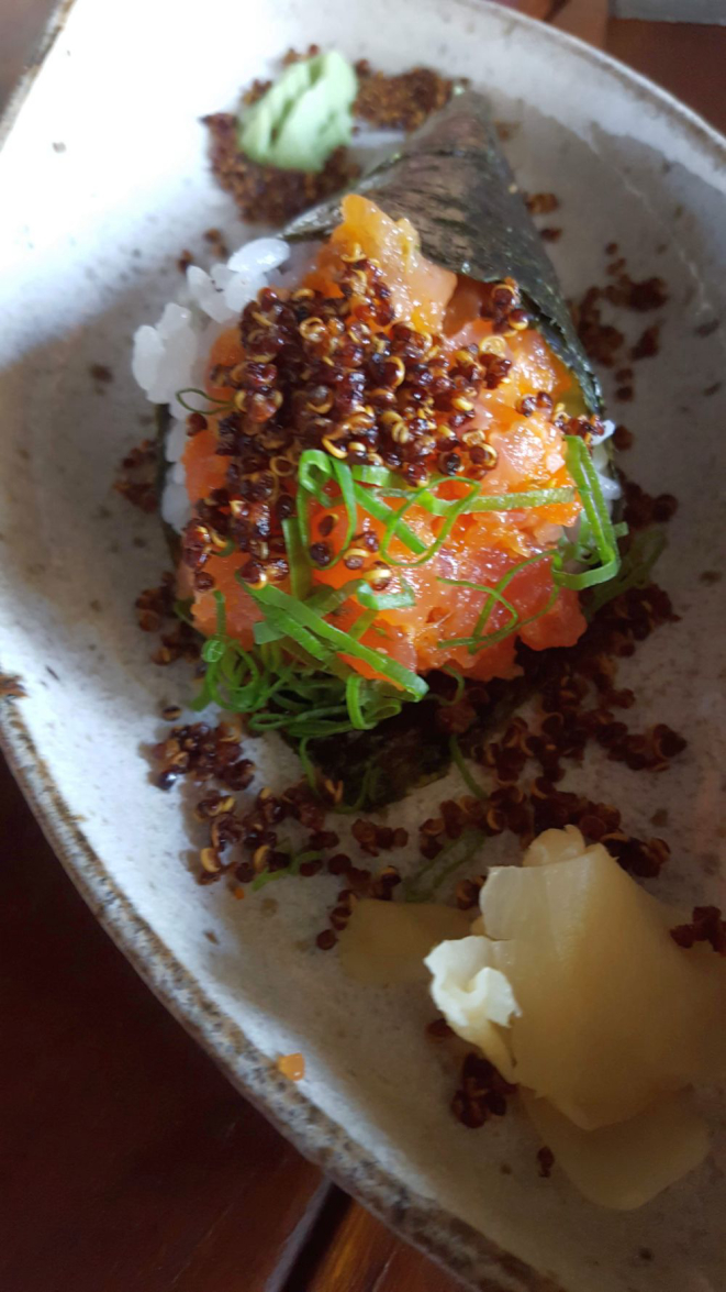 O que chama atenção são os guiozas recheados com camarão, shiitake e cebola caramelizada (acompanha molho de pimenta peruana), o mini temaki de salmão finalizado com quinoa crocante e a porção de camarões ao molho de pimenta amarela que é servida em duas conchas e chega à mesa flamejando.