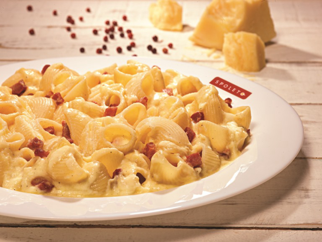 O lumaconi é servido com três tipos de molhos: caprese (tomate, ricota e manjericão – R$ 12,90), carbonara (com bacon no lugar do toucinho – R$ 14,90) e bolognesa clássico (R$ 10,90). Outro lançamento é a Saladinha Spoleto, com mix de folhas, cubos de frango, molho Caesar e queijo parmesão — custa R$ 4,90.