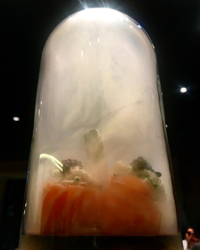 Surpreenda-se com o Magic Lab, com salmão defumado, mostarda Dijon e molho de alho. Chega à mesa em uma redoma de vidro, envolto em fumaça de canela em pau (duas unidades, 8 euros ou R$ 34). E é o suficiente para um “óóó geral” nas outras mesas.
