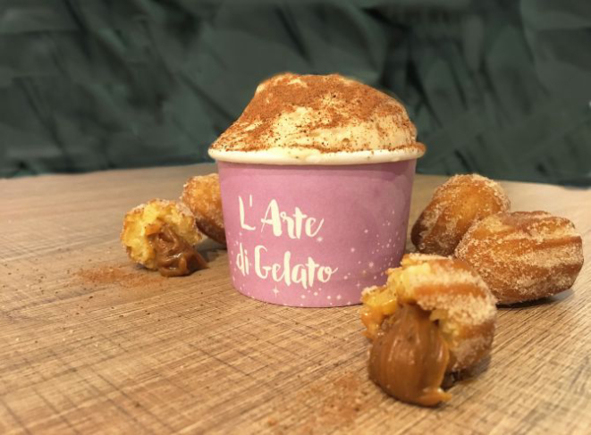O gelato italiano também tem uma versão dedicada ao doce argentino. No estabeleicimento, o gelato de churros é um dos mais de 20 sabores na vitrine. Sua composição leva creme de leite, doce de leite, canela e açúcar. É servido em quatro opções de tamanho: R$ 11,50 o justo, R$ 13, o expert; R$ 15 o profissional; e R$ 24 o immenso.