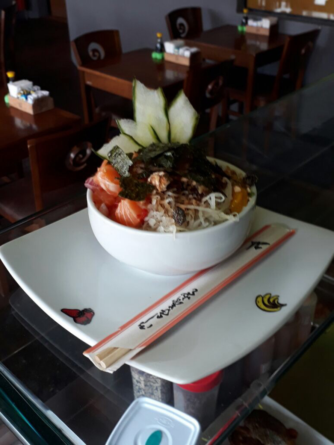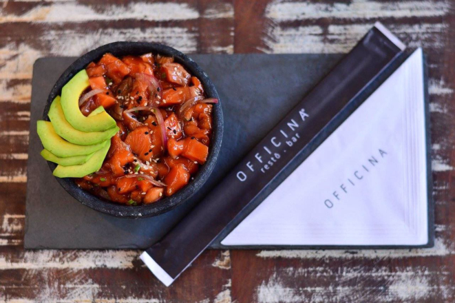 O Officina Restô Bar conta com uma opção de poke em seu cardápio. Ele custa R$ 37 e leva como base gohan (arroz japonês), salmão marinado no shoyu, óleo de gergelim, pimenta tabasco, cebola roxa, cebolinha e gergelim. Ele vem acompanhado de abacate ou pepino, dependendo da época do ano.