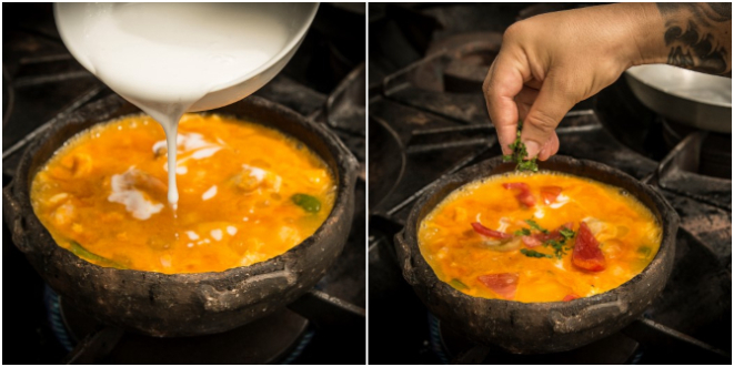 O leite de coco, por sua vez, confere cremosidade e consistência, mas para extrair melhor seu sabor, deve ser adicionado apenas na etapa final do preparo. “Além do frescor que ele oferece à moqueca, colocando por último você adiciona um leve sabor de coco no molho”, explica.