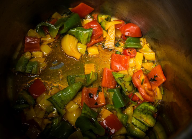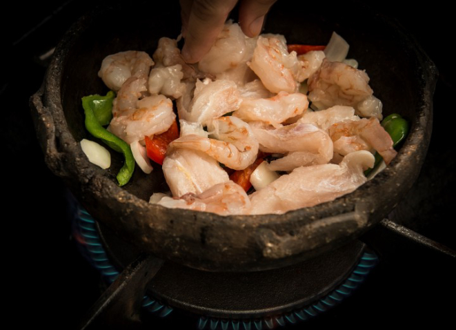 Em um fio quente de óleo de milho ou de soja, refogue a cebola e os pimentões. Tempere o peixe e o camarão com sal e pimenta e adicione-os junto aos legumes.