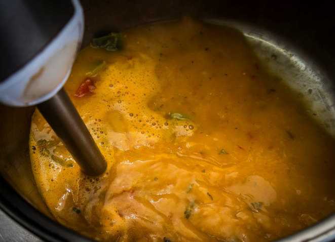 3 – Após retirar do fogo, bata tudo em um liquidificador ou mixer e reserve. Este é o molho-base para o preparo da moqueca.