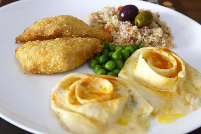 Prato com rondeli quatro queijos, tilápia na panco e salada de quinoa. Foto: Henry Milleo/Gazeta do Povo.