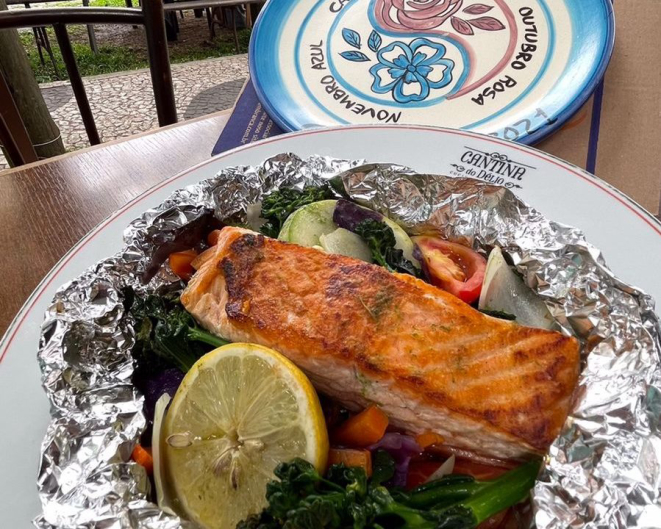 “Um delicioso cartoccio de salmão com legumes. Esse é um método onde o alimento é colocado em uma bolsa, e depois, assado. É a umidade do próprio alimento que cozinha o salmão e os legumes”, explica.
