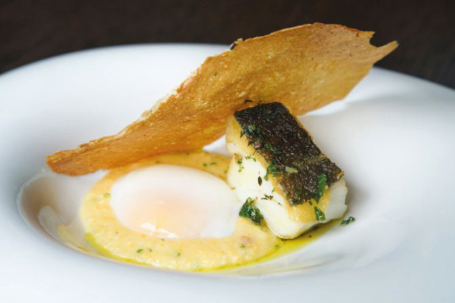 O lombo de bacalhau confitado com alho e ervas do restaurante Mukeka é servido com pasta de grão de bico da casa, ovo pochê e molho piu piu feito com o colágeno do próprio bacalhau. Preço: R$ 79. Serve uma pessoa. Assinantes da Gazeta do Povo têm 20% de desconto.