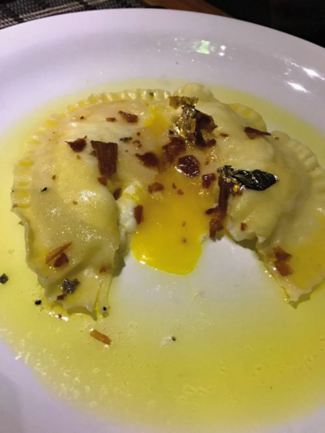 O Ravioloni d’Oro é recheado com queijo mascarpone e gema de ovo caipira e é servido na manteiga clarificada com trufas negras, presunto Parma crocante e pedacinhos de folha de ouro comestível. O prato é uma das opções de entrada do cardápio e custa R$ 29.