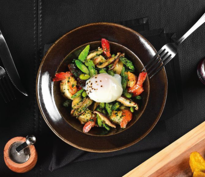 Neste restaurante com jeito de bar tem salada quente de aspargos, camarões, alho, shiitake e edamame feitos à provençal e servidos com ovo perfeito. Preço: R$ 90.