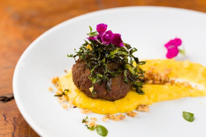 Polpettine de Porco Moura recheado com creme de Taioba na Mousseline de Banana da Terra