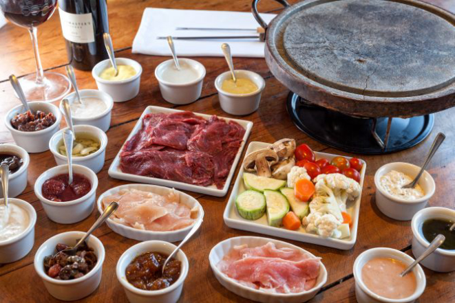 De prato principal, é possível escolher entre o Foundue Bourguignonne — cubos de filet mignon, frango e lombinho, fritos na gordura de coco, acompanhado com oito tipos de molhos para temperar as carnes — e o fondue na pedra — finas fatias de mignon, frango e lombinho, grelhados em um réchaud de pedra, acompanhado com oito tipos de molhos. Fechando a refeição, fondue de chocolate preto ou de doce de leite argentino, ambos acompanhados de oito tipos de frutas e marshmallow. Reservas e horário de funcionamento.