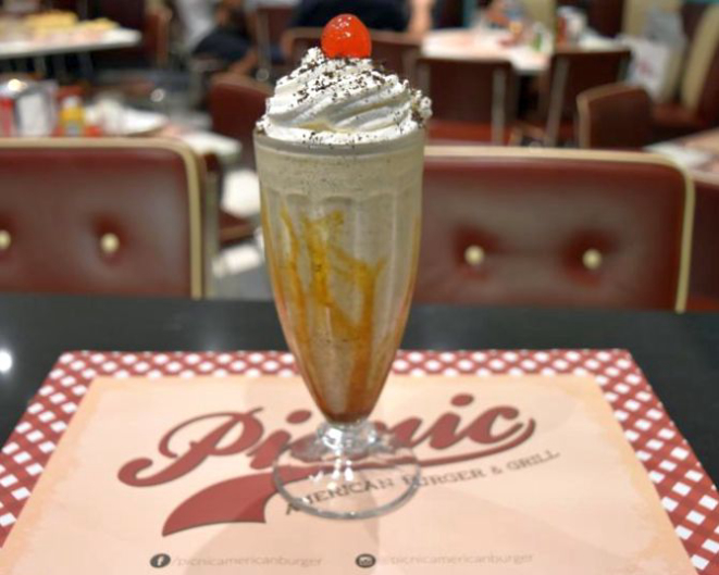 O clássico biscoito recheado Oreo também pode ser uma bebida para refrescar. O milk shake de Oreo do Picnic American Burguer & Grill, por R$ 14,90. A bebida tem sorvete de creme batido com calda de caramelo e biscoito Oreo. Leva ainda chantilly, Oreo moída e tubetes na composição.