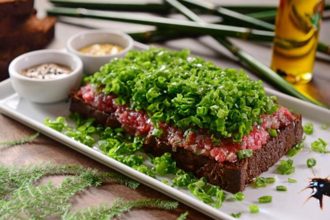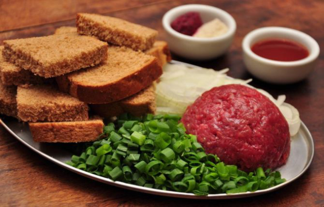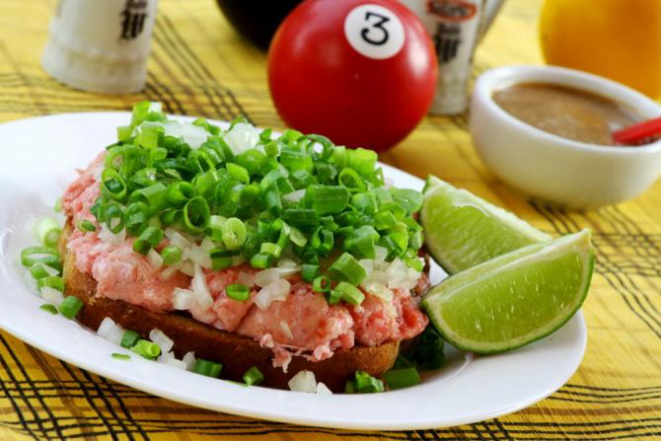 Para variar o cardápio do estabelecimento, a carne de onça preparada com carne moída crua com cebola, alho, salsinha, azeite de oliva e cebolinha. Servida com broa preta.