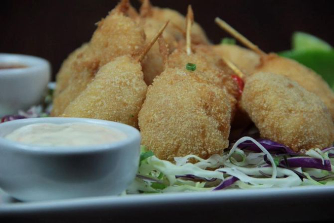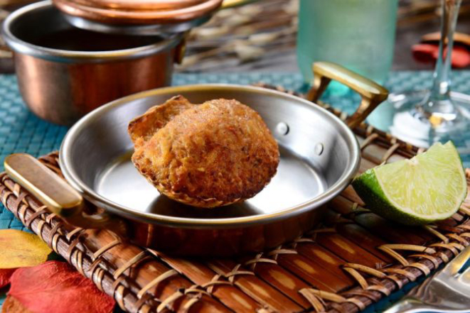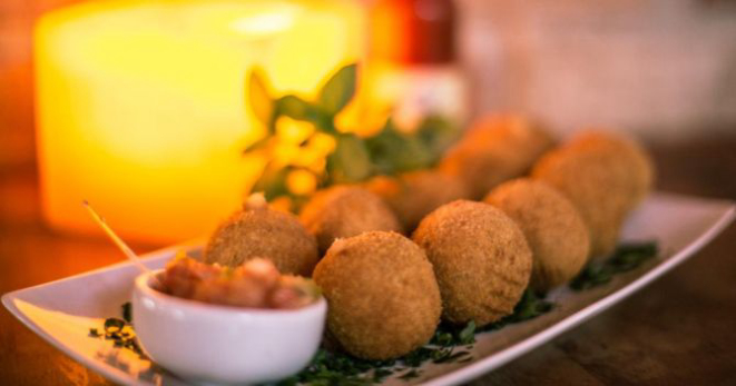 Uma mistura bem brasileira: bolinho de mandioca recheado com carne seca. Acompanha molho golf (R$ 33,90).