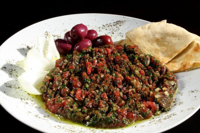 A porção de kafta crua é feita com carne de patinho livre de gordura, moída com cebolinha, salsinha e especiarias árabes. Acompanha azeite de oliva, pão árabe e cebola.