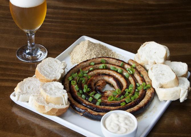 A Cervejaria da Vila oferece uma porção de linguiça de pernil (R$ 29,90) com duas opções de recheio: provolone com tomate seco ou damasco com castanha-do-pará. Acompanha maionese e farofa temperadas, e rodelas de pão.