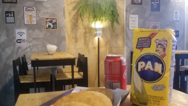 A farinha é a base das arepas (R$ 16), preparos de formato cilíndrico e achatado crocantes por fora e macias por dentro, que são fritas e cortadas ao meio para receber o recheio. "As arepas, cuja criação é disputada entre Venezuela e Colômbia, são comuns nos cafés da manhã nas casas venezuelanas. Nas ruas, elas costumam ser mais elaboradas, com recheios diversos". Na hora de servir, as arepas fazem as vezes do pão dos sanduíches tradicionais, mas existe uma versão aberta e turbinada, que leva carne ou frango, ovo cozido, presunto, queijo de Minas, peito de peru, batata-palha, tomate, repolho e cenoura ralada (R$ 20).
