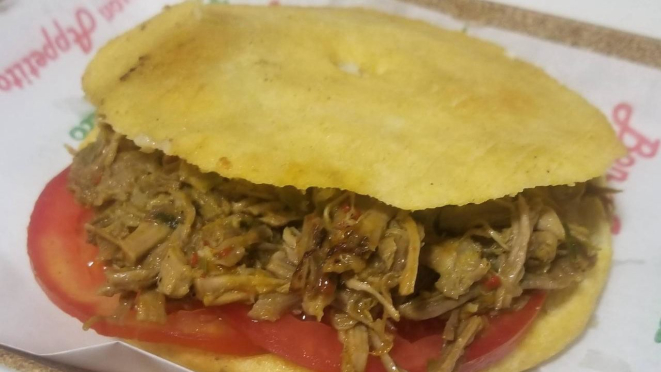 O recheio de carne, cujo preparo leva em torno de duas horas e meia, é feito com fraldinha cozinha na pressão com alho, pimenta do reino e outros temperos, além do já citado coentro. "Depois de cozida, a carne é desfiada e fica bem macia". O frango leva a mesma base de temperos, mas é apresentado com pedaço mais inteiros. Além das opções carne e frango, que são servidos nos patacones e arepas com alface,tomate e queijo Minas, há ainda a oferta do recheio de queijo e presunto, que também vai acompanhado de alface e tomate.