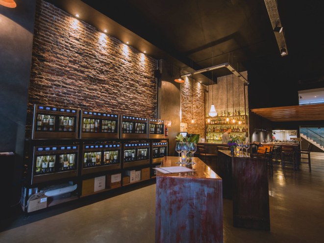 O mergulho no mundo dos vinhos começa logo na entrada do bar, onde estão à nossa espera três máquinas de vinhos brancos – organizados por casta, acidez, frescor, complexidade, dentre outros aspectos. Em seguida, encontramos quatro rótulos de vinhos rosés e quatro máquinas com vinhos tintos jovens e médios, como um exclusivo Pinot Noir e uma raridade: um rótulo da uva Criolla, que estava desaparecida havia anos e começa a ganhar destaque entre os paladares mais exigentes.