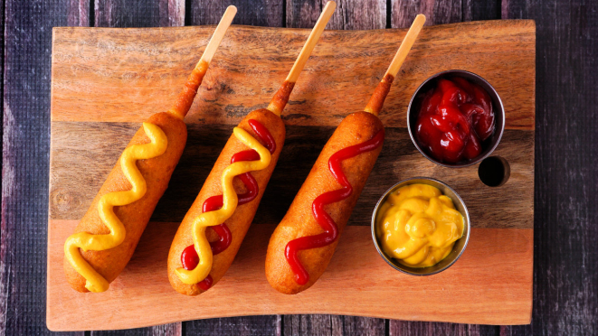 - Frite os corn dogs em óleo quente (180ºC) até que estejam dourados. Sirva-os com ketchup e mostarda.