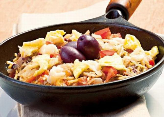 O chef Robson Gesso, do Gonzales y Garcia, apresentou uma entrada quente que é destaque no cardápio do restaurante: fritada de bacalhau, com ovos, tomates, azeitonas e batata palha. “O ovo vai só no final para fritar e dar a liga ao prato”, explica.