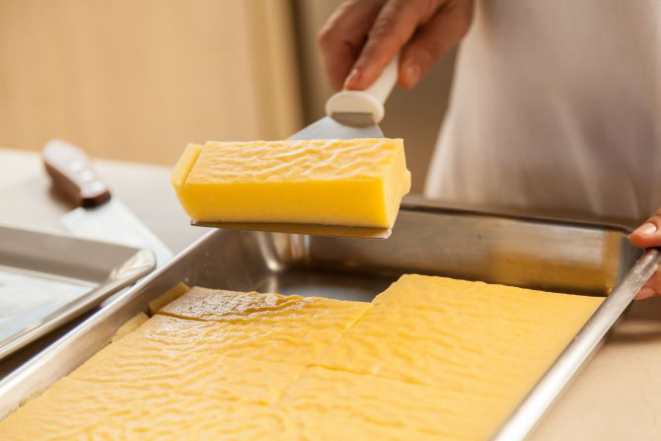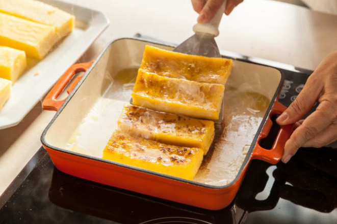 2. Corte as fatias de polenta na espessura de 2 dedos de largura e um de altura.
