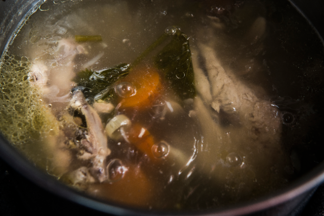 Para o caldo, desosse dois peitos de frango. A carne será usada no molho e as carcaças vão para fervura em 1 litro de água junto com cenoura, salsão, alho-poró, cebola, alho e sal. Cozinhe por 1 hora com a tampa fechada em fogo médio enquanto prepara os outros ingredientes. Depois de pronto peneire e reserve.