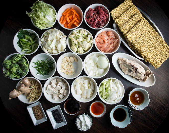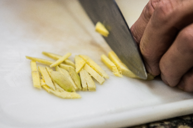 A dica de corte para a cenoura, a acelga, o repolho e o gengibre é o julienne, formato de tiras longas e finas. Corte também as carnes em tiras e desbaste o brócolis e a couve-flor em pequenos pedaços. O salsão, o alho-poró e o alho, corte em rodelas finas e a cebola, em pedaços triangulares grandes.