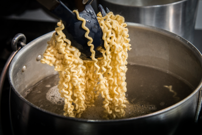 Com o mise en place pronto, é hora de cozinhar o macarrão. Na água fervente, adicione a massa e, com um pegador, mexa até ela se soltar. Uma grande quantidade de água, cerca de 2 litros, facilita a manipulação. Depois de cozido al dente, escorra, lave com água fria para interromper o cozimento e reserve.