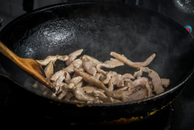 Em um fio de óleo quente, frite o gengibre e depois o alho, até dourar. Essa etapa realça o sabor dos ingredientes quando misturados ao molho. Frite separadamente a carne vermelha e o frango, temperados com sal e pimenta, até ficarem ao ponto. Em seguida, misture todos os ingredientes.