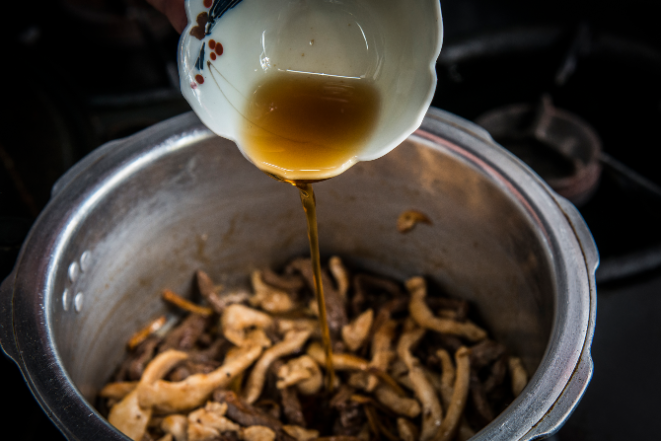 Adicione óleo de gergelim, shoyu, molho inglês e misture. Em seguida coloque o caldo aos poucos e deixe ferver em fogo médio. Tempere com sal e pimenta a gosto, além do tempero oriental a base de peixe. Dilua o amido de milho em água e acrescente ao molho para engrossar. Ferva por 5 minutos para sair o gosto do amido.