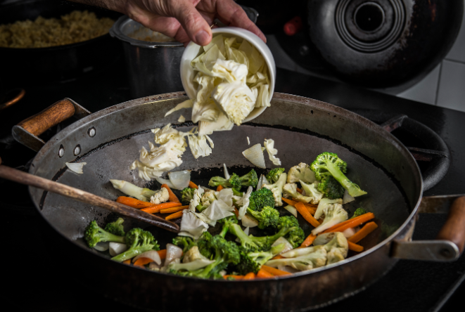Salteie os legumes dos mais duros aos mais moles: a cenoura, o brócolis, a couve-flor vêm primeiro, depois a cebola, o salsão, o alho e o alho-poró. Quando estiverem cozidos e crocantes, misture com o macarrão frito.
