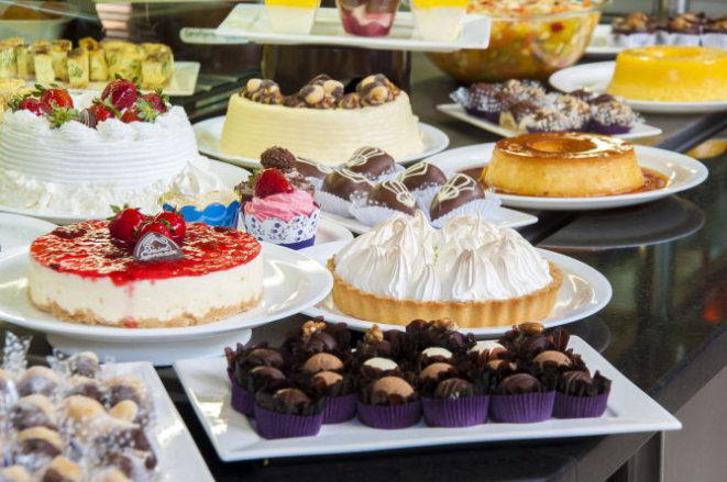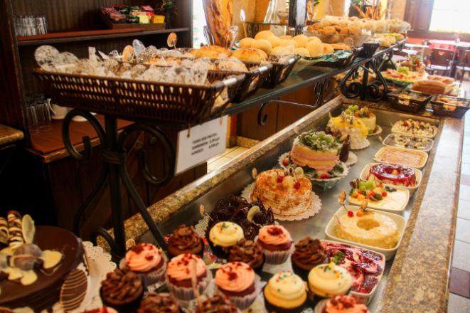 Para adoçar a refeição, a casa serve docinhos, sonhos, bolos caseiros recheados, cucas, sobremesas como cheesecake, creme de avelã, bombocado, quindim, e seis tortas doces – marta rocha, chocolate, morango e naked cake são alguns dos sabores. Os destaques da casa são o brownie e o strudel. Além disso, o buffet sempre conta com uma opção de sobremesa diet e zero lactose.
