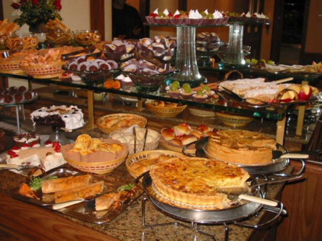 Na confeitaria Valbella, o buffet inclui frios, salgados assados (croissant de queijo e presunto, folhado de carne e de palmito e quiches) e fritos (rissole, bolinha de queijo e coxinha de frango, servidos na mesa com reposição), empadão de frango palmito, pão de queijo e torta suíça. Nos doces, a casa oferece dois tipos de geleia (de morango e damasco), dois tipos de bolos secos, doces folhados e de oito a dez tipos de torta.