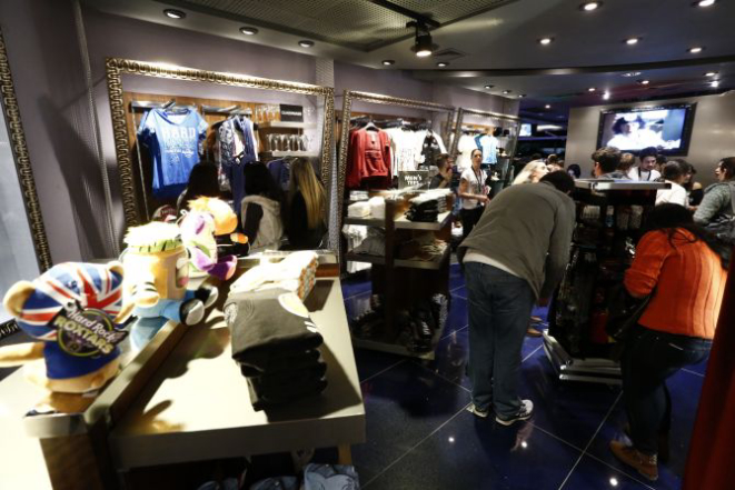 Na entrada do bar fica a loja do Hard Rock Cafe com souvenires que levam a logomarca da casa. Dentre os itens estão bonés masculinos e femininos (R$ 79), camisetas clássicas (de R$ 99 a R$ 129), macaquinhos para bebês (R$ 109, rosa ou azul), moletons (de R$ 219 a R$ 239), jaqueta de couro masculina (R$ 779), casaco estilo colegial feminina (R$ 489), chaveiros (R$ 59) e isqueiros (R$ 199).