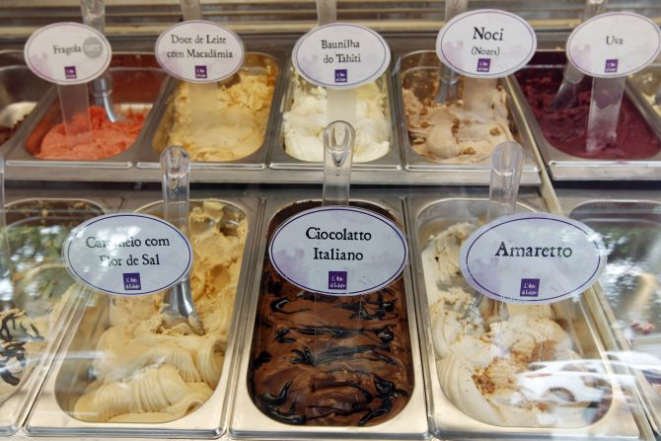 Os sorvetes são mantidos a 13 graus C negativos na vitrine por, no máximo, três dias. Dentre os sabores, há morango, maracujá, mimosa (castanha de caju, canela e chocolate meio amargo), chocolate, caramelo com flor de sal, limão siciliano, baunilha, nozes, gianduia (com creme de avelã), doce de leite com macadâmia, chocolate branco com avelã, chocolate branco com frutas vermelhas, papaya, menta com chocolate e cream cheese com calda de morango, para citar alguns. Os sorvetes são servidos em potinhos: um sabor sai por R$ 11,50 (entre 90 e 100 g), dois sabores, R$ 13 (entre 120 e 130 g) e três sabores por R$ 15 (150 g). Para levar, há embalagens de 500 g e 1 kg. O preço do quilo é R$ 82, salvo no caso de sabores especiais, como o de pistache (servido apenas às sextas-feiras) e os alcoólicos, que fica R$ 93.