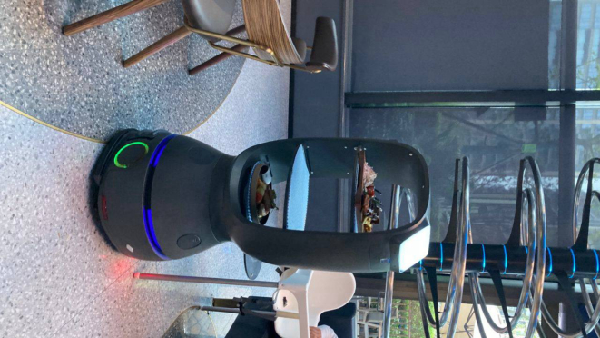 O vídeo mostra bem a comida sendo levada pelos robozinhos: