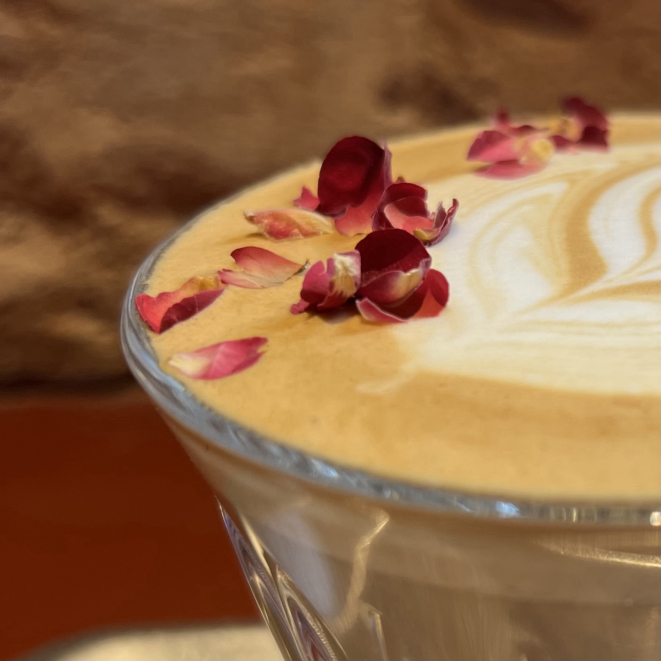 Na chegada do copo à mesa, primeira grata surpresa, o perfume das rosas chegaram milissegundos antes mas não competiam com o tão esperado cheirinho bom do café com leite, parece que harmoniosamente se somavam. As mini pétalas não só decoraram, não só coloriam, encantavam!