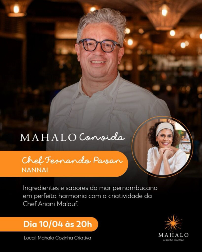 O Mahalo Cozinha Criativa, restaurante premiado da chef Ariani Malouf, em Cuiabá, será palco de um jantar a quatro mãos no próximo dia 10 de abril. O evento faz parte do projeto "Mahalo Convida Chefs do Brasil", e terá pela primeira vez como convidado o chef Fernando Pavan, à frente dos restaurantes TiaTê dos resorts NANNAI, em Muro Alto e Fernando de Noronha, em Pernambuco.