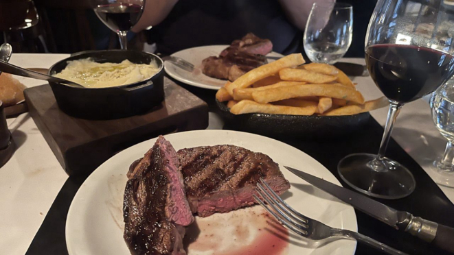 Minha experiência por lá atendeu a expectativa. Posso garantir que comi a melhor empanada da vida, recheada de carne suculenta cortada em pequenos pedacinhos. De entrada, pedimos a provoleta de queijo de cabra que eu achei interessante experimentar. É mais suave que a feita com provolone tradicional. De principal, eu fui de Ojo De Bife, uma peça enorme de 500 g que eu não consegui terminar. Na próxima vez irei dividir. Neto foi de Chorizo, que estava mais macio e suculento que eu meu pedido. Para acompanhar, malbec argentino e batatas fritas crocantes. O purê não valeu a pena. A sobremesa crepe de doce de leite é imperdível. Valor da conta ficou em 5.6650 pesos. Fazendo câmbio blue por lá fica em torno de R$800.