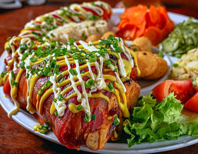 de batata (salsicha vermelha e salsicha branca com batata salteada na